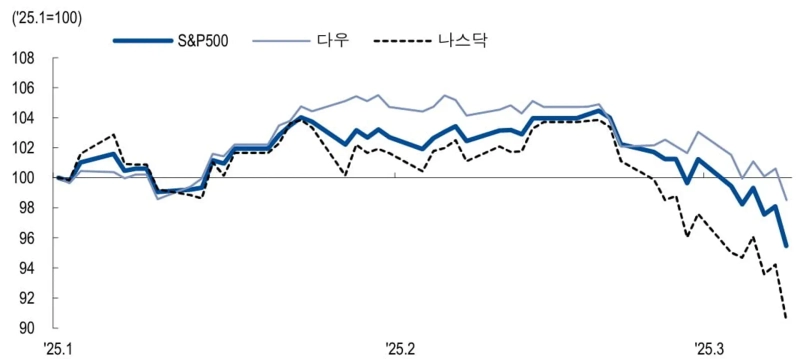 김환 NH투자증권 연구원은 "기술주 중심의 나스닥지수가 4% 급락했고, 다우지수와 S&P500지수가 2%대 밀렸다"며 "관세 공포에 따른 경기 둔화 우려, 경제지표 부진, 독일의 재정 확대 기대감 약화 등 때문"이라고 설명했다.