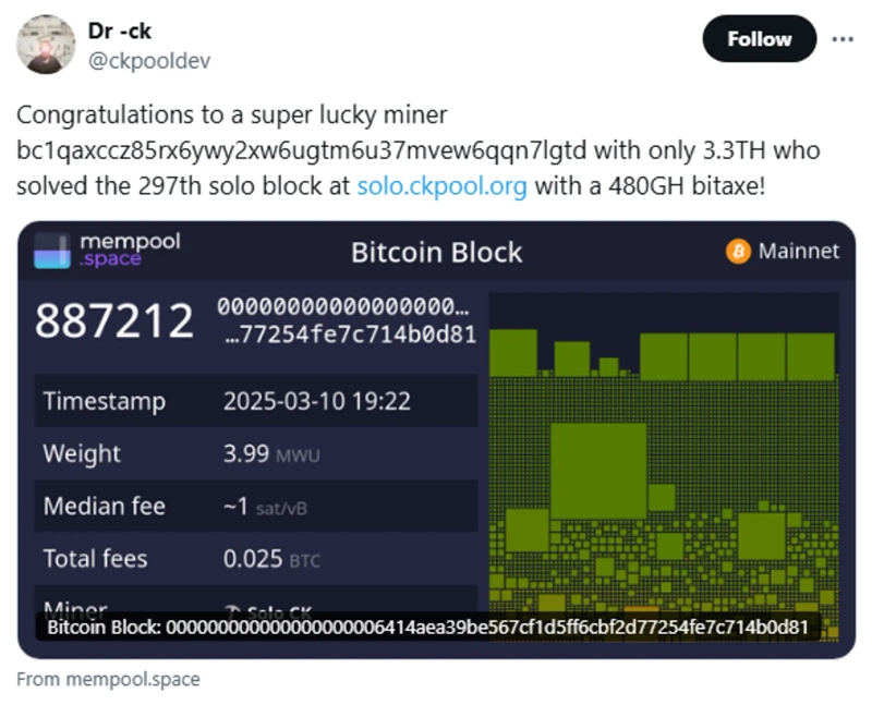 - 개인 채굴자가 블록을 찾을 확률은 극히 낮아 이번 성공은 매우 희귀한 사례라고 밝혔다.
