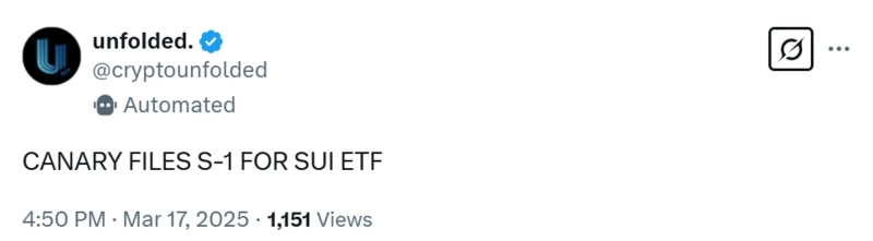 17일(현지시간) 가상자산(암호화폐) 분석 플랫폼 언폴디드에 따르면 가상자산 투자사 커네리 캐피털(Canary Capital)이 미국 증권거래위원회(SEC)에 수이(SUI) 상장지수펀드(ETF)에 대한 신청서(S-1)를 제출했다.