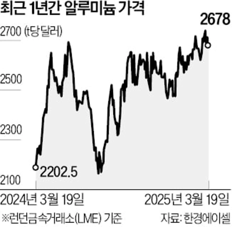 알루미늄값은 지난 12일 t당 2737달러까지 오르며 2022년 5월 이후 최고치를 기록했다. 트럼프 대통령이 미국 내 철강 및 알루미늄 산업 경쟁력을 높이겠다며 철강·알루미늄 등에 관세 25%를 부과하기 시작했기 때문이다. 미국은 자체 알루미늄 생산량이 적어 80% 이상을 캐나다, 러시아, 중국 등에서 수입하고 있다. 원자재 시장 관계자는 "트럼프 대통령의 관세 정책이 예견되면서 실제로 세금이 붙기 전부터 사전에 물량을 확보하려는 수요가 늘었다"고 말했다.
