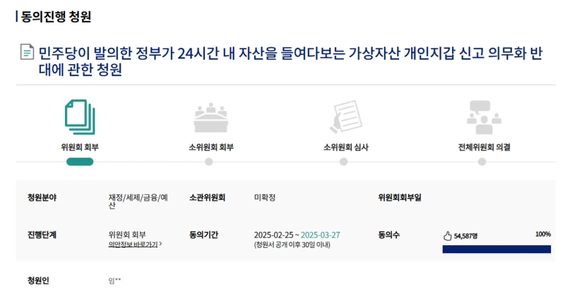 가상자산(암호화폐) 개인지갑 신고 의무화 반대에 관한 청원이 국회 각 위원회 회부 요건을 충족한 것으로 나타났다.