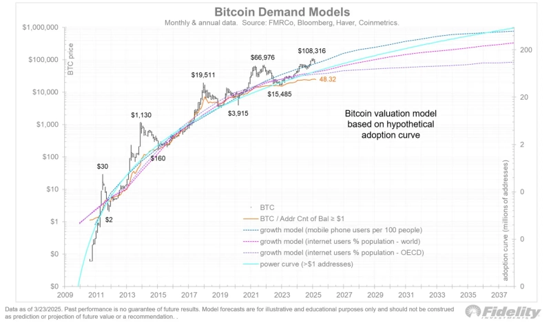 25일(현지시간) 주리엔 티머 피델리티 글로벌 매크로 부문 총괄은 엑스(구 트위터)를 통해 "비트코인은 계속해서 수요 모델과 네트워크의 거듭제곱 법칙 곡선의 경로를 따르고 있다"며 "다만 실제 주소와 지갑 수는 지난 1년 동안 거의 증가하지 않았다"고 말했다.