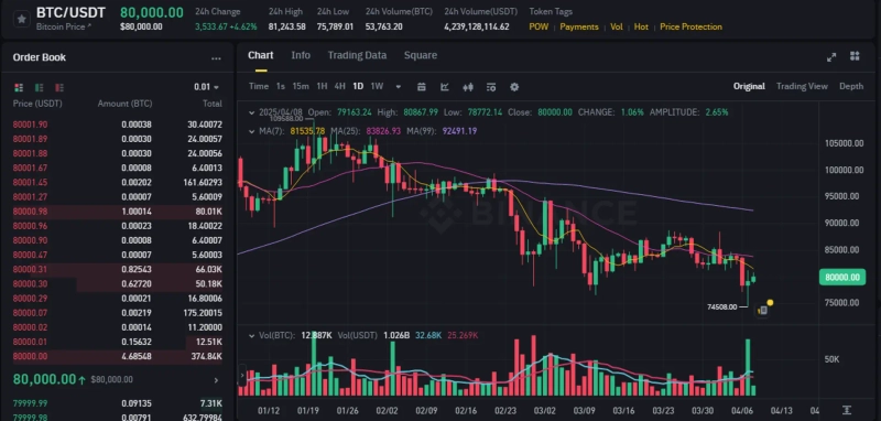 8일(현지시각) 오후 9시 6분 바이낸스 USDT마켓 기준 비트코인은 24시간 전 대비 4.62% 상승한 8만 달러에 거래되고 있다.