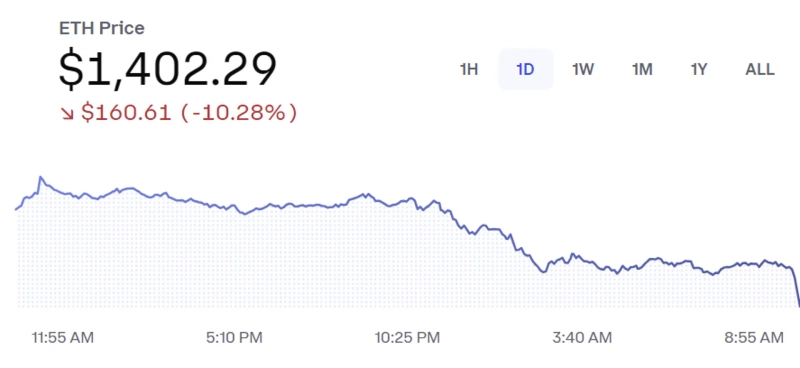 9일(한국시간) 오전 10시 22분 현재 이더리움은 글로벌 가상자산 거래소 코인베이스에서 전일대비 10.28% 급락한 1402.29달러에 거래되고 있다.