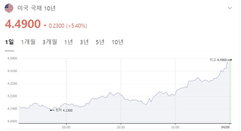 9일(한국시간) 미국채 10년물 금리가 5.40% 급등해 4.4900%를 기록했다.
