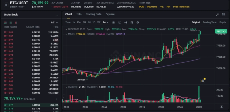 오후 11시 1분 현재 바이낸스 USDT마켓 기준 비트코인은 24시간 전 대비 2.01% 하락한 7만8159달러에 거래되고 있다.
