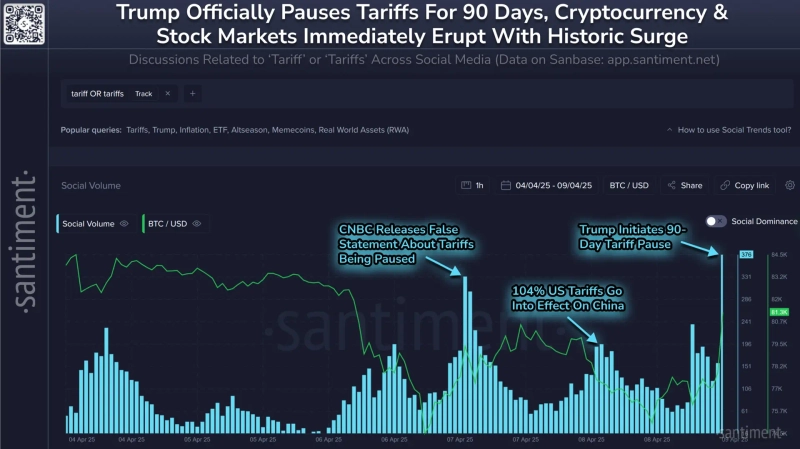 온체인 분석 플랫폼 샌티멘트는 10일 공식 엑스(X) 계정을 통해 "미국의 관세 유예 발표 직후 가상자산과 주식 시장이 급등했다"며 "투자자들이 포모에 휩싸여 다시 시장에 진입하고 있다"고 밝혔다. 샌티멘트는 "이번 호재는 여전히 해결되지 않은 이슈가 일시적으로 완화된 것에 불과하다"며 "시장 펀더멘털(기초체력)은 여전히 불확실하고 신뢰하기 어렵다"고 했다.
