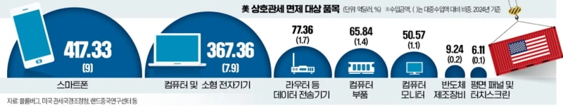 블룸버그통신에 따르면 20가지 항목의 미국 수입 규모는 지난해 기준 3900억달러에 달한다. 이 중 1010억달러어치가 중국산이다. 중국 스마트폰 수입 규모는 417억달러 수준이다. 중국에서 수입되는 전체 물량의 9%를 차지한다. 컴퓨터 및 유사 기기 수입액도 367억달러에 이른다. 전체적으로 관세 면제 대상은 지난해 중국 수입품의 약 22%에 달한다. 중국을 상대로 매긴 125% 상호관세 부과 계획에서 5분의 1이 벌써 '열외' 처리된 것이다.