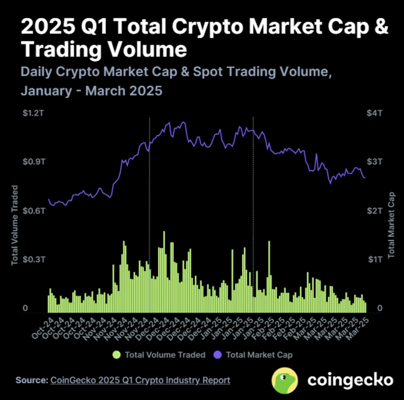 - 올해 1분기 가상자산 전체 시가총액이 전분기 대비 18.6% 하락했다고 코인게코 보고서가 밝혔다.