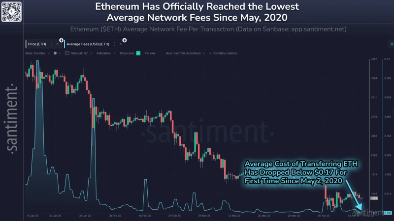이더리움 가격 반등 가능성도 시사했다. 샌티멘트는 "일반적으로 수수료가 1달러 이하일 경우 대중의 관심이 줄었다는 신호로 해석된다"며 "역사적으로 낮은 수수료는 가격 반등에 앞서 나타나는 경우가 많다"고 분석했다. 이어 "현재 같은 구간에서 매수하는 건 일반적으로 리스크가 낮은 선택으로 간주된다"고 했다.