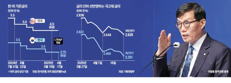 대선 일정과 관계없이 통화정책을 결정하겠다는 이 총재의 발언도 5월 인하설에 힘을 보탰다. 그는 대선 투표일을 닷새 앞두고 금리를 내리면 불필요한 오해를 초래할 수 있다는 지적에 대해 "5월 인하 가능성이 크다고 (시장은) 당연히 해석할 것"이라며 "정치를 고려하지 않고 경제 상황만 보고 판단할 것"이라고 강조했다.
