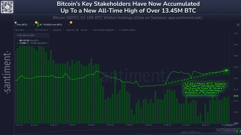 19일 온체인 데이터 플랫폼 샌티멘트는 엑스(X·옛 트위터)를 통해 "비트코인을 10개 이상 1만개 이하 보유한 '상어·고래' 지갑은 전체 비트코인 공급량의 약 67.77%를 점유하고 있다"면서 "이들은 지난달 22일 이후 약 5만3600 BTC를 순매수했다"라고 밝혔다.