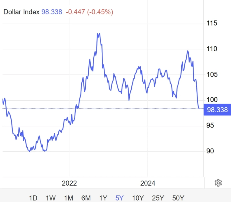 특히 시장 분위기를 잘 보여준 것은 달러 인덱스였는데요. 2022년 2월 이후 3년 만의 최저치를 기록했습니다. 현재 전날보다 0.45% 가량 떨어진 98.3 선에서 거래가 되고 있는데요. 달러가치가 떨어진 대신 유로화와 엔화, 스위스프랑 가치가 각각 1% 정도 올랐습니다.