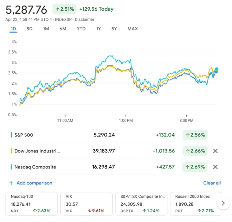 - 미국 증시는 트럼프 대통령의 관세 정책 완화 가능성에 크게 상승했다.