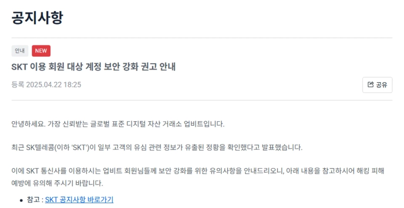 - 가상자산 거래소들이 SK텔레콤 유심 정보 유출 사태로 인해 투자자들에게 계정 보안 강화를 촉구했다고 전했다.