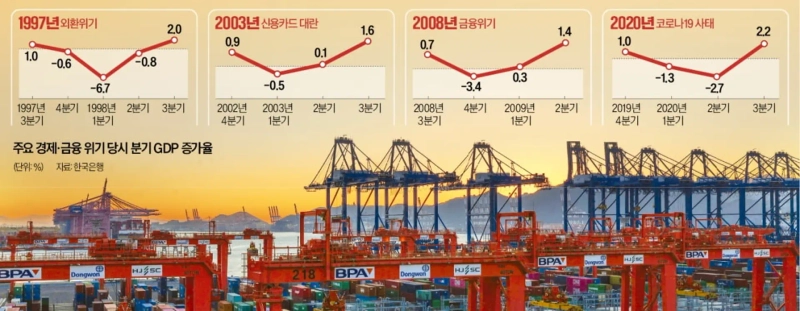 이런 저성장 국면은 과거 대규모 경제·금융 위기 때도 경험하지 못했다. 1997년 외환위기 당시엔 세 분기 연속 마이너스 성장을 한 후 네 번째 분기(1998년 3분기)에 2% 고성장을 기록했다. 2003년 신용카드 대란, 2008년 글로벌 금융위기, 2020년 코로나19 사태 당시에도 성장률은 한두 분기 뒷걸음질한 뒤 큰 폭으로 반등했다.