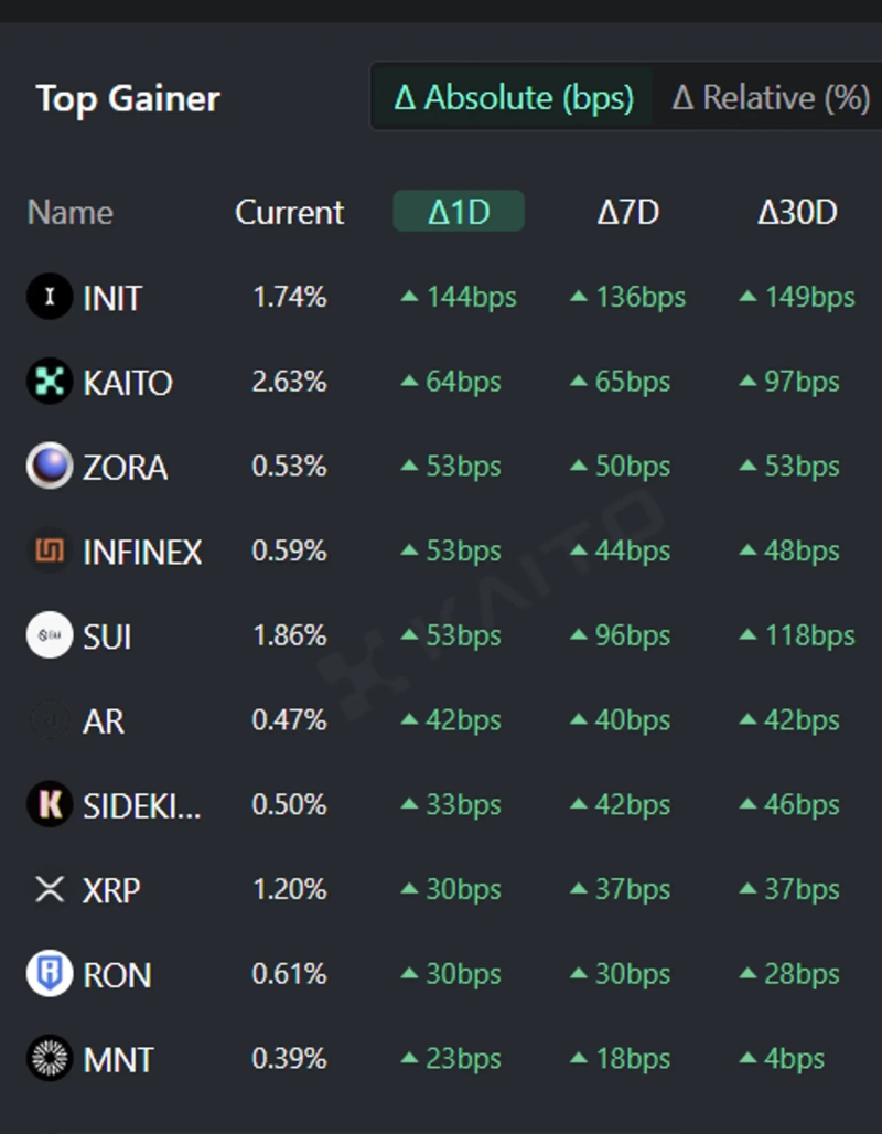 인공지능(AI) 기반 웹3 서치 플랫폼 카이토(Kaito)의 토큰 마인드셰어(Token Mindshare·가상자산 시장 내 특정 토큰의 영향력을 정량화한 지표) 탑게이너에 따르면 25일 현재 사람들이 가장 많이 관심을 보이고 있는 가상자산 상위 5개는 이니시아(INIT), 카이토(KAITO), 조라(ZORA), 인피넥스(Infinex), 수이(SUI) 등이다.