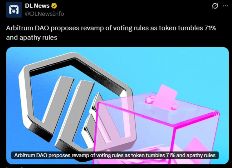 - 아비트럼(ARB)은 거버넌스 참여 저조로 1년 동안 71% 하락했다고 밝혔다.