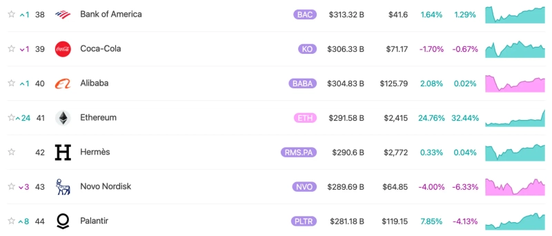 - 이더리움이 2400달러를 넘어 시가총액이 2953억달러에 달하며 글로벌 자산 순위 41위에 올랐다고 전했다.