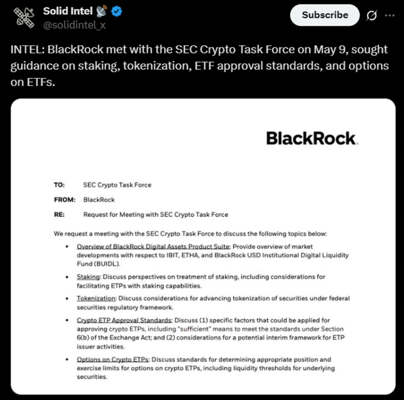 9일(현지시간) 솔리드인텔에 따르면 블랙록이 이날 미국 증권거래위원회(SEC) 가상자산(암호화폐) 태스크포스(TF)팀와 미팅을 진행, 스테이킹, 토큰화, 상장지수펀드(ETF) 승인 기준, ETF 옵션 등에 대한 규정을 요구한 것으로 나타났다.