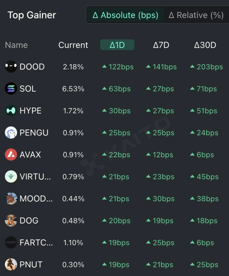 인공지능(AI) 기반 웹3 서치 플랫폼 카이토(Kaito)의 토큰 마인드셰어(Token Mindshare·가상자산 시장 내 특정 토큰의 영향력을 정량화한 지표) 탑게이너에 따르면 10일 현재 사람들이 가장 많이 관심을 보이고 있는 가상자산 상위 5개는 두들스(DOOD), 솔라나(SOL), 하이퍼리퀴드(HYPE), 퍼지펭귄(PENGU), 아발란체(AVAX) 등이다.