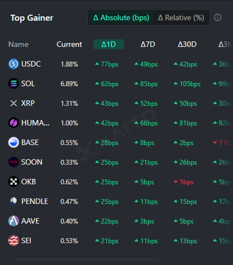 인공지능(AI) 기반 웹3 서치 플랫폼 카이토(Kaito)의 토큰 마인드셰어(Token Mindshare·가상자산 시장 내 특정 토큰의 영향력을 정량화한 지표) 탑게이너에 따르면 19일 현재 사람들이 가장 많이 관심을 보이고 있는 가상자산 상위 5개는 USDC, 솔라나(SOL), 엑스알피(XRP), 휴마 파이낸스(HUMAFINANCE), 베이스 프로토콜(BASE) 등이다.