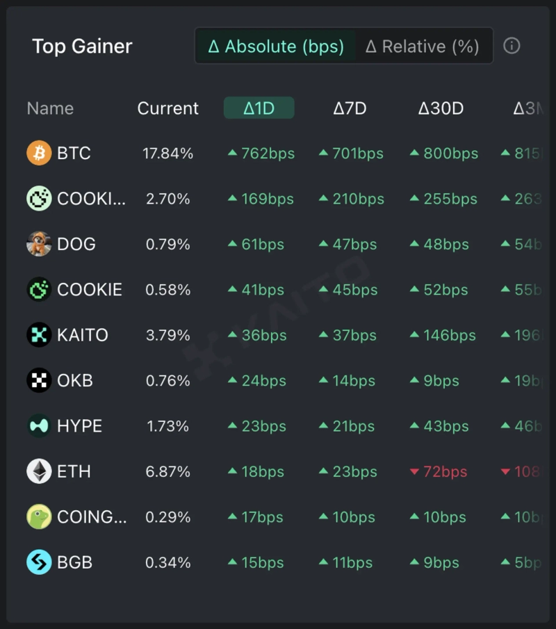 인공지능(AI) 기반 웹3 서치 플랫폼 카이토(Kaito)의 토큰 마인드셰어(Token Mindshare·가상자산 시장 내 특정 토큰의 영향력을 정량화한 지표) 탑게이너에 따르면 22일 현재 사람들이 가장 많이 관심을 보이고 있는 가상자산 상위 5개는 비트코인(BTC), 쿠키다오(COOKIE), 카이토(KAITO), 하이퍼리퀴드(HYPE), 이더리움(ETH) 등이다.