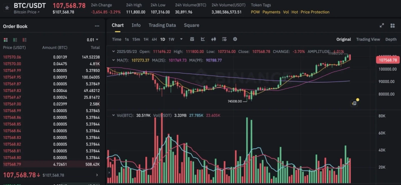 23일(현지시간) 글로벌 가상자산 거래소 바이낸스 테더(USDT) 마켓에서 비트코인은 전일 대비 약 3.3% 하락한 10만7500달러대에서 거래되고 있다. 비트코인은 전날 11만1980달러를 기록하며 사상 최고치를 경신한 바 있다.