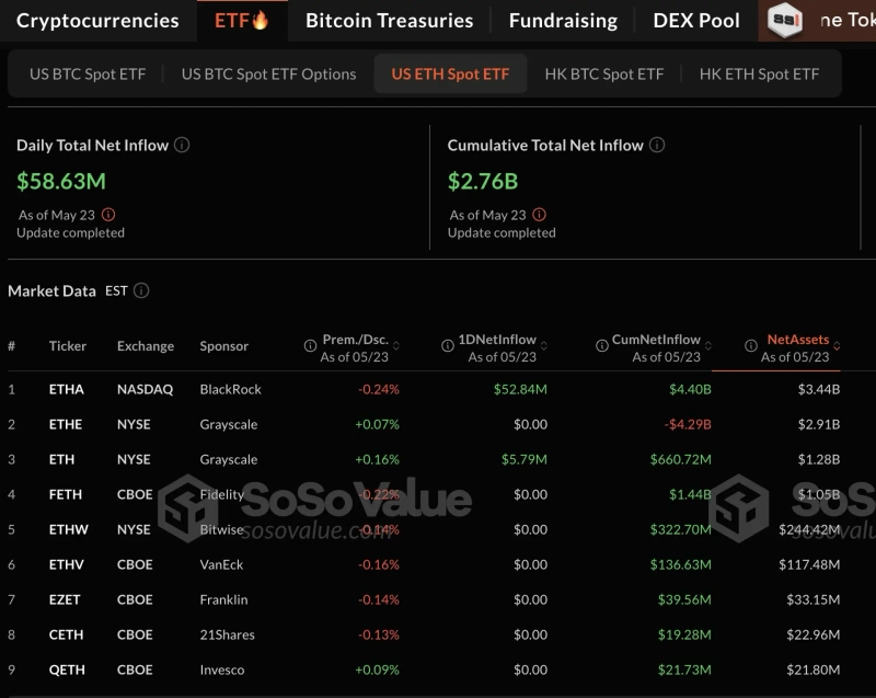 23일(현지시간) 소소밸류의 데이터에 따르면 미국에서 거래되고 있는 이더리움 현물 ETF에 5862만9500달러 규모의 순유입이 발생했다.