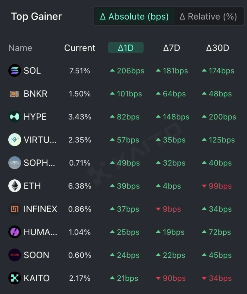 인공지능(AI) 기반 웹3 서치 플랫폼 카이토(Kaito)의 토큰 마인드셰어(Token Mindshare·가상자산 시장 내 특정 토큰의 영향력을 정량화한 지표) 탑게이너에 따르면 24일 현재 사람들이 가장 많이 관심을 보이고 있는 가상자산 상위 5개는 솔라나(SOL), 뱅커코인(BNKR), 하이퍼리퀴드(HYPE), 버츄어프로토콜(VIRTUAL), 소폰(SOPHON) 등이다.