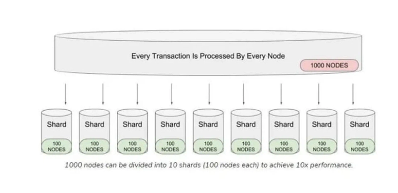 샤딩이란 데이터베이스와 블록체인에서 처리 속도를 극대화하기 위해 사용하는 분산 처리 기술이다. 하나의 장부를 모든 참여자가 공유하는 블록체인 구조에서는, 동시에 여러 사용자가 거래를 기록하려 할 경우 병목 현상이 발생한다. 이를 해결하기 위해 장부를 쪼개고, 트랜잭션을 병렬로 처리할 수 있는 파이프라인을 다수 설치하는 방식이 샤딩이다.