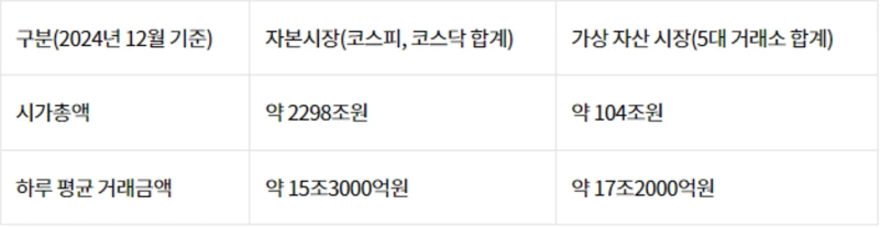 - 한국 가상 자산 시장은 시가총액이 104조 원에 이르며, 하루 평균 거래 금액이 17조 2000억 원으로 자본시장 규모를 능가하는 수준이라고 전했다.