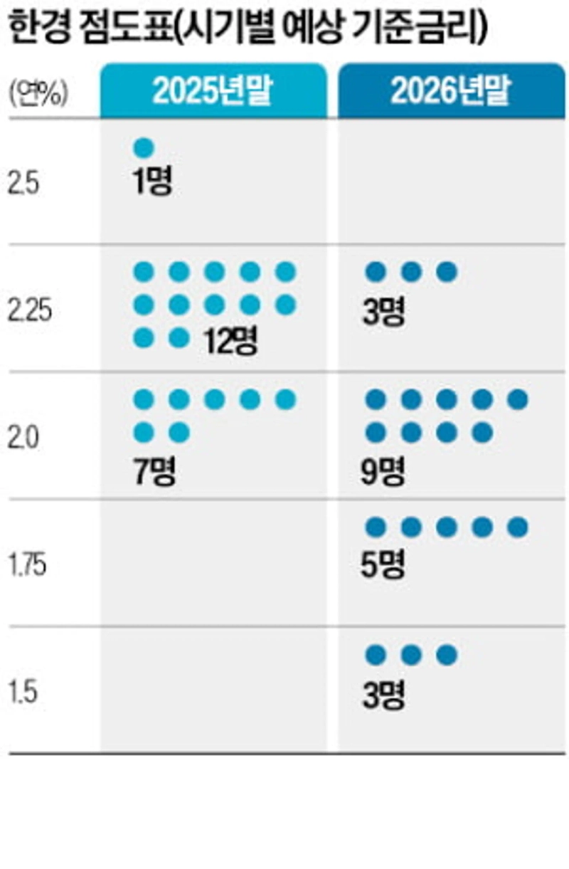 전문가 20명 중 19명(95%)은 올해 말 기준금리 수준을 2.25~2.5%로 예상했다. 현재 금리 수준(연 2.75%)을 고려할 때 이달 인하를 제외하고도 한두 차례 더 금리를 내릴 것으로 봤다.