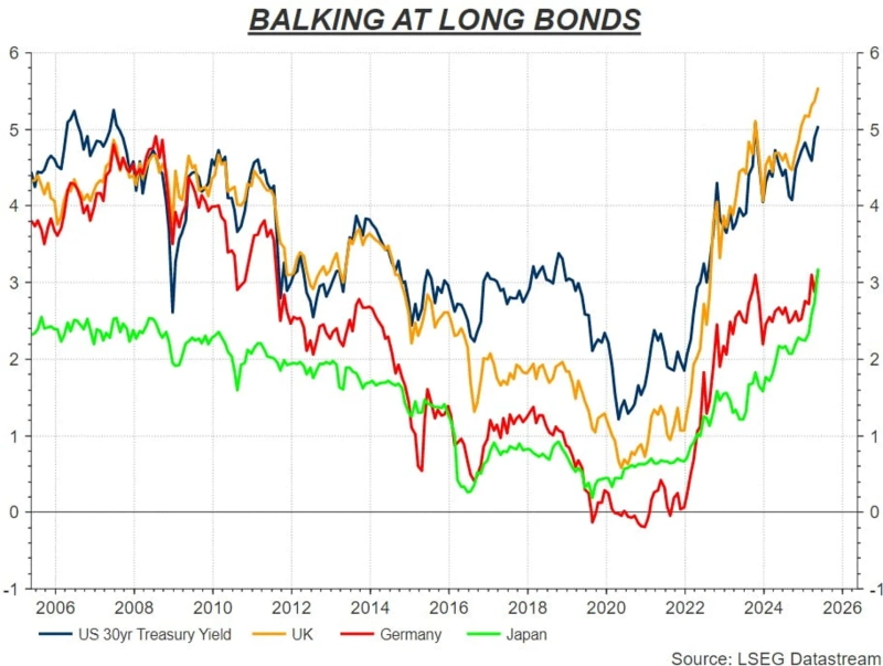 장기국채 수익률이 전 세계적으로 상승세입니다. 도널드 트럼프 대통령의 상호관세가 28일(현지시간) 미국 국제무역법원에서 무효 판결을 받고, 또 24시간이 채 지나지 않아 그 무효 판결이 집행 정지를 받는 해프닝(?)이 벌어지면서 시장의 관심이 잠시 관세로 쏠리긴 했으나 최근 시장의 굵직한 흐름을 좌우해온 것은 금리, 더 정확히 말하면 장기국채 수익률입니다.