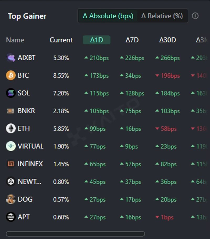 인공지능(AI) 기반 웹3 서치 플랫폼 카이토(Kaito)의 토큰 마인드셰어(Token Mindshare·가상자산 시장 내 특정 토큰의 영향력을 정량화한 지표) 탑게이너에 따르면 1일 현재 사람들이 가장 많이 관심을 보이고 있는 가상자산 상위 5개는 에이아이엑스비티(AIXBT), 비트코인(BTC), 솔라나(SOL), 뱅커코인(BNKR), 이더리움(ETH) 등이다.