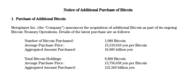 - 이번 매수로 메타플래닛의 비트코인 보유량은 총 8888개가 됐다고 밝혔다.