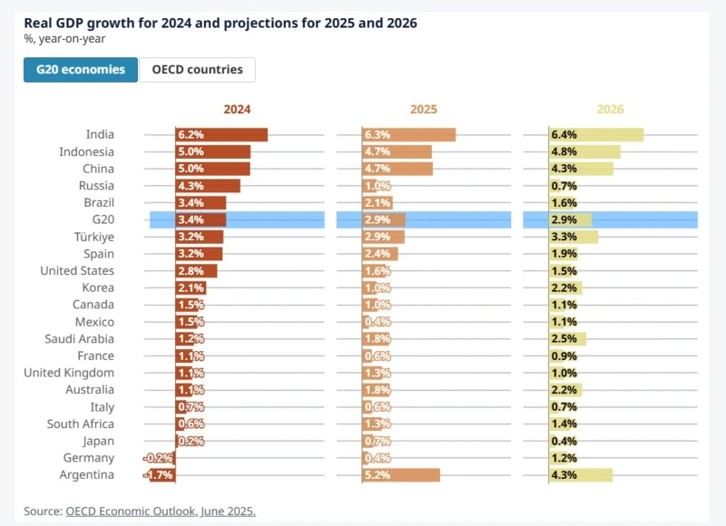 5월 중순 기준의 관세율이 지속된다는 가정하에, OECD는 세계 GDP 성장률이 지난 해 3.3%에서 올해 2.9%에 이어, 내년 2.9%로 둔화될 것으로 예상했다. 3월 보고서에는 올해 세계 성장률을 3.1%, 2026년에는 3%로 예측했었다.