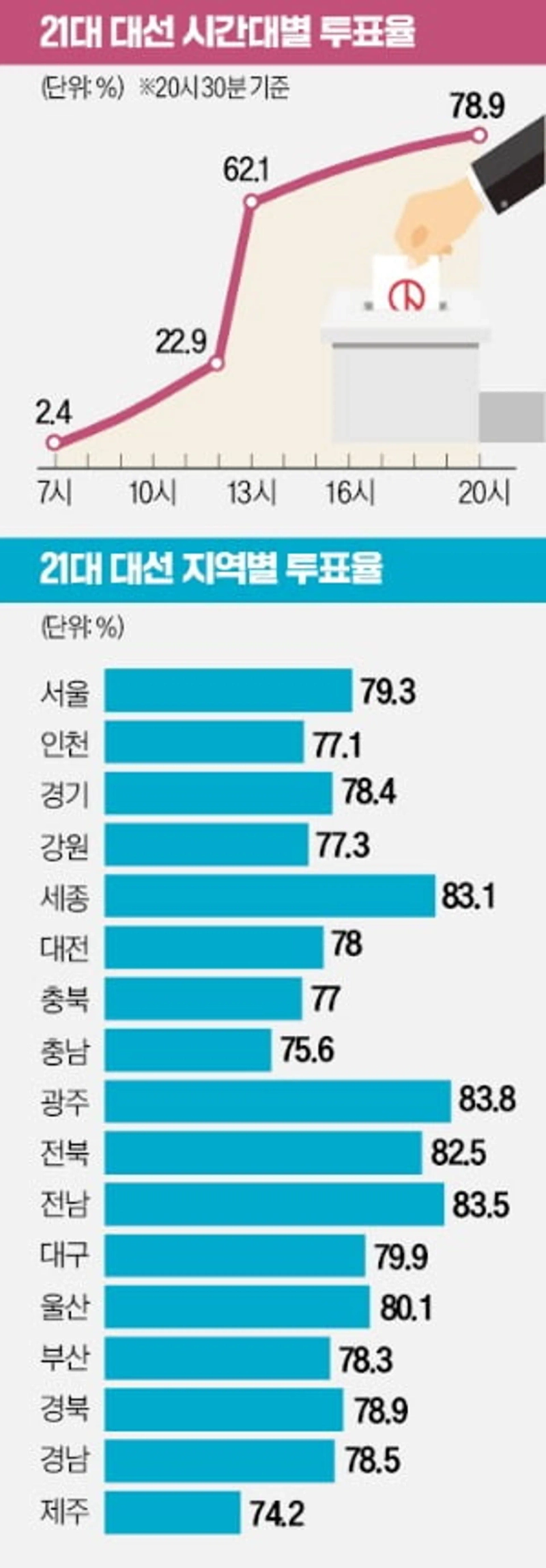제주 '최저' … 충청 평균 밑돌아21대 대선 투표율 78.9% … 15대 이후 최고
