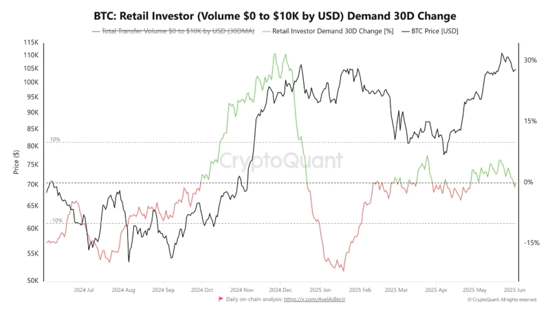 개인 투자자의 비트코인(BTC) 수요가 감소하고 있다는 분석이 나왔다.