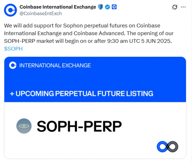 4일(현지시간) 글로벌 가상자산(암호화폐) 파생상품 거래소 코인베이스 인터내셔널 익스체인지(Coinbase International Exchange)가 X(구 트위터)를 통해 5일 18시 30분(한국시간) 소폰(SOPH) 무기한 선물을 상장한다고 공지했다.