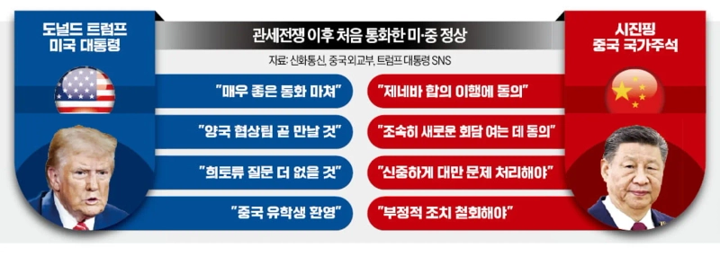 6일 중국 외교부와 신화통신 등에 따르면 전날 도널드 트럼프 미국 대통령과 시진핑 중국 국가주석이 통화한 건 트럼프 2기 행정부 출범 직전인 지난 1월 17일 이후 처음이다. 이날 통화에선 관세 전쟁 2라운드를 방불케 한 미·중 무역 갈등의 핵심인 중국 희토류 수출 제한 문제가 집중 논의된 것으로 알려졌다.