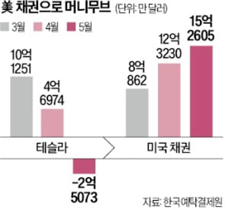 반면 미국 주식은 매도세가 완연하다. 테슬라는 같은 기간 2억5073만달러(3421억원)를 팔았다. 테슬라는 올해 1월부터 3월까지 매월 해외 주식 순매수 1위에 올랐다. 지난 4월에도 순매수 2위를 기록할 만큼 꾸준한 매수세가 이어졌으나 5월부터는 매도세가 더 컸다. 올 1분기 테슬라(-35%)와 엔비디아(-19%)가 급락하면서 미국 주식 투자심리가 위축된 것이다. 5월 국내 투자자는 미국 주식을 13억1085만달러어치 순매도해 7개월 만에 '팔자'로 돌아섰다.