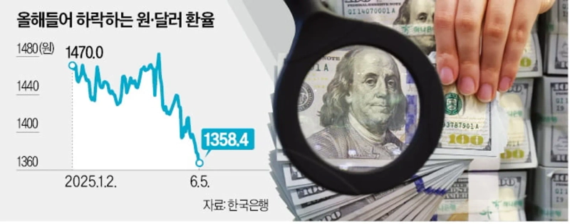 - 원·달러 환율이 7개월 만에 1350원대로 하락하며 이번주에도 점진적 하락세가 이어질 것으로 전망된다고 전했다.