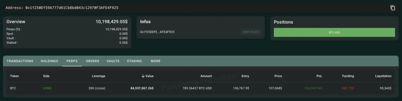 익명의 고래가 탈중앙화 선물 거래소 하이퍼리퀴드(HYPE)에서 20배 비트코인(BTC) 롱(매수) 포지션을 구축한 것으로 나타났다.