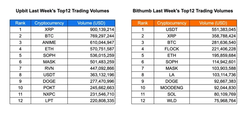 지난주 거래량은 업비트와 빗썸 간에 뚜렷한 차이를 보였다. 업비트에서는 XRP가 9억달러 가까운 거래량으로 1위를 차지했고, 비트코인과 ANIME, SOPH, MASK 등 중소형 토큰들이 5억달러 이상을 기록했다. NXPC, POKT도 상위 12위권에 오르며, 내러티브 기반 알트코인에 대한 국내 수요가 꾸준하다는 점을 보여줬다.