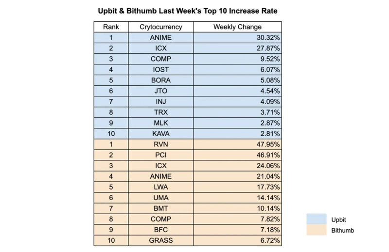 주간 주요 상승 종목으로는 ANIME, ICX, RVN, PCI가 꼽히며, 양 거래소 모두에서 로컬 내러티브 및 고변동성 종목에 대한 관심이 일관되게 나타났다.