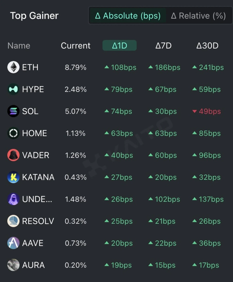 인공지능(AI)기반 웹3 서치 플랫폼 카이토(Kaito)의 토큰 마인드셰어(Token Mindshare·가상자산 시장 내 특정 토큰의 영향력을 정량화한 지표) 탑게이너에 따르면 11일 현재 사람들이 가장 많이 관심을 보이고 있는 가상자산 관련 키워드 상위 5개는 이더리움(ETH), 하이퍼리퀴드(HYPE), 솔라나(SOL), 디파이앱(HOME), 베이더AI by 버츄얼(VADER) 등이다