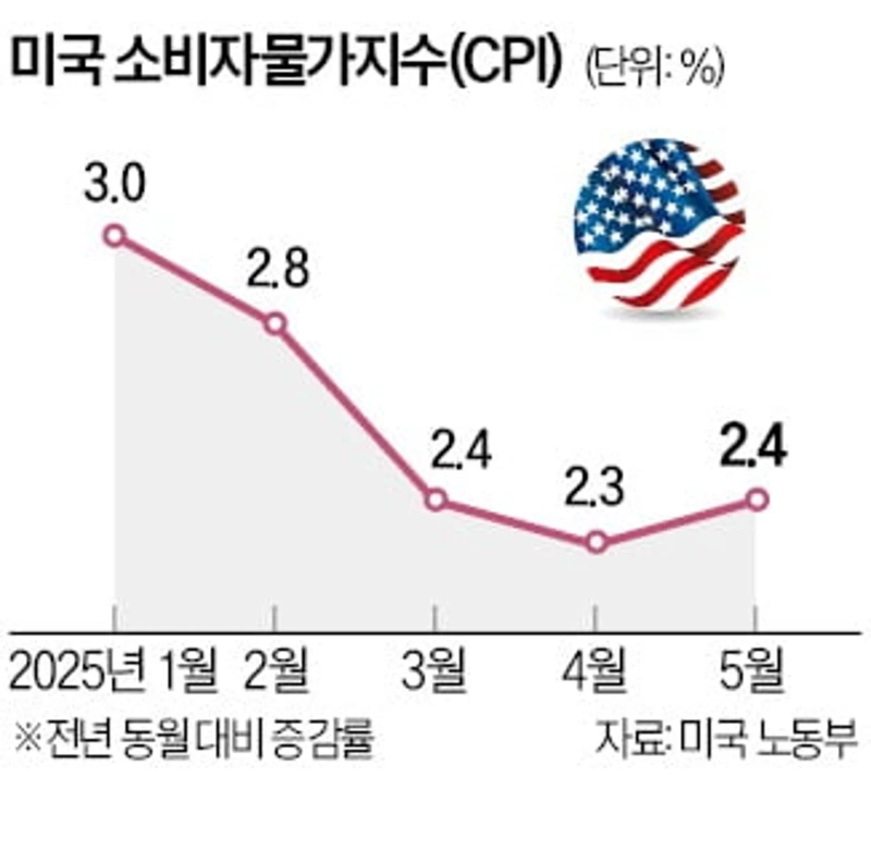 - 미국의 5월 소비자물가지수(CPI)가 2.4% 상승해 전문가 전망치를 소폭 밑돌았다고 밝혔습니다.
