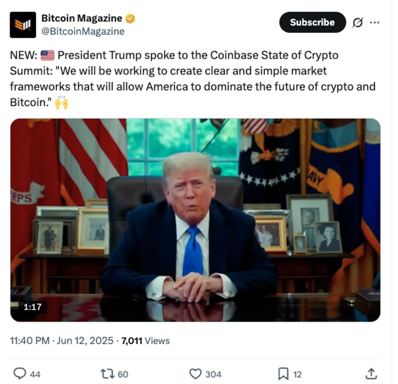 12일(현지시간) 가상자산 전문 미디어 비트코인 매거진에 따르면 이날 트럼프 대통령은 코인베이스가 주최한 '스테이트 오브 크립토 서밋(State of Crypto Summit)' 연설에서 "미국이 가상자산와 비트코인(BTC)의 미래를 지배할 수 있도록 명확하고 단순한 시장 프레임워크를 구축하겠다"라고 밝혔다.