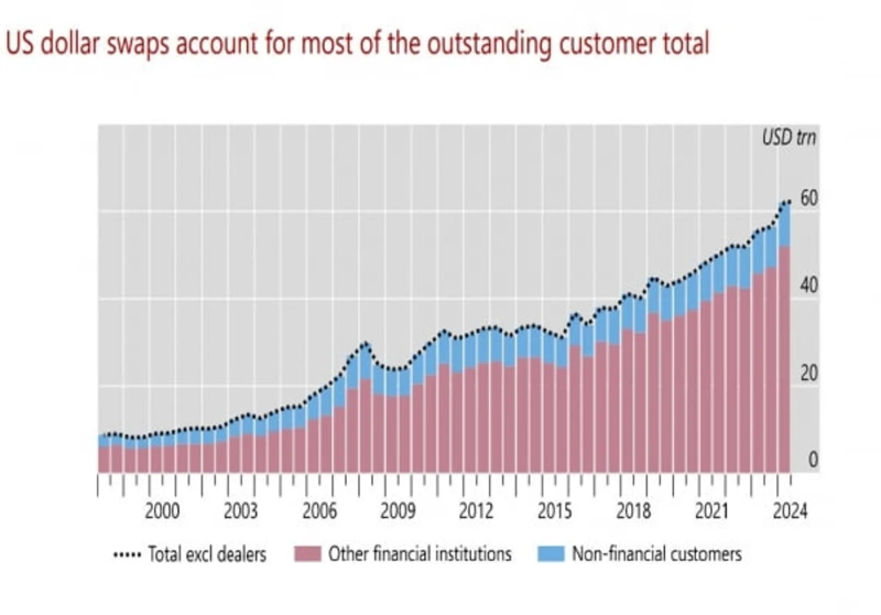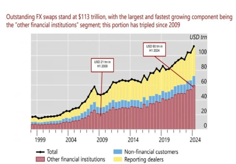 정부 부채 누적 속도가 민간 부채보다 가팔라졌다. 은행에서 돈 빌리기보다는 '채권 찍어 팔기'가 보편화됐다. 정부까지 뛰어들면서 채권 시장이 압도적으로 커졌다. 채권 시장의 큰손이 된 비은행 투자자는 해외 국채에 투자하려면 '통화 위험'을 헤지해야 한다. 가장 쉬운 방식이 단기 FX 스와프다. 거래 잔액이 2009년 21조달러에서 2024년 60조 달러로 5년 새 세 배 급증했다.
